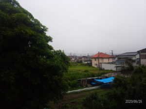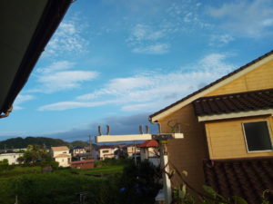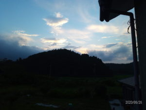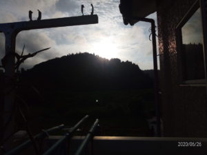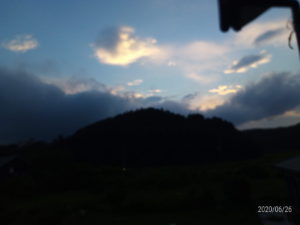5時8分の空は海側の山には霧が掛かって居ます。ホトトギスが近くを飛んでいて、ヨシキリの賑やかな声が響いて居ます。