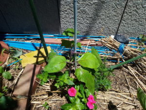 今朝の庭です。南瓜の子蔓が走り出しました。3本は柿の木方面に、後はバラバラです。昨日の雨は降ったり止んだりで太陽が弱く数回差しただけなので、水分を含んだ土です。お昼ごろまで作業はお預けになりそうです。