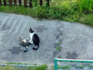 食後3時間経過し、休んでいた猫達はカリカリを食べて外出です。
