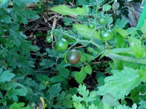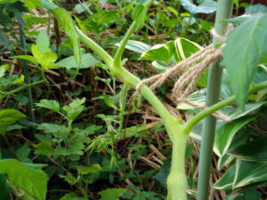 左: シシリアンルージュの実が色付きました。第一果房は確か実が一つなので、色付きに影響するので、収穫してから主軸を結わきます。右: 少しずつ里芋が生長してきています。やはり、気温と降雨の影響は大きいですね。EMボトル1㍑を四隅に結わきました。