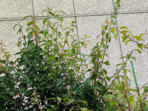 左と中: 遠目から見たので、剪定をしたのが分からないかも知れませんね。長くて日の光が中まで届かなかったり、ぶつかっている枝同士もあったり、で半分くらいに剪定しました。一度徒長枝を4―5月に15―20㎝位で剪定しているので、そこから二股に分かれて細目の枝が出ていました。