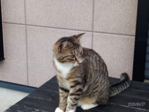 16時、うめが食事に帰って来ました。何と几帳面で時間を守る仔でしょう!?トラ子もジュレを食べました。お隣の物置で涼んでいる処へ福が来て情報交換。『僕、ジュレ、食べたよ~!あしょんで貰ったし~。』福が夏蜜柑の樹を渡って食事にやってきました。