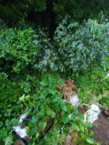 東の写真では分かり難いですが、南の写真ではカイヅカイブキの木が南西の強風にあおられています。雨は東の窓も南西の窓もビショビショにしています。網戸が無ければ分からない位、ガラスの上を雨が流れています。4時43分の撮影でした。