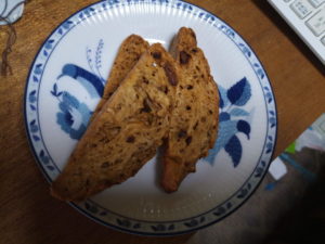 ビスコッティは板チョコほぼ一枚(途中でどこかへ消えてしまった分を除いて!)、卵2個、砂糖100g、インスタントコーヒー大匙1、BP8g、小麦粉280g、水150gで、ナマコ焼き180度で15分、切ってから180度で10分、そのまま放置。しかし、今まで物より湿気が多い気がしたので、180度で予熱、2分間焼いてそのまま放置しました。カリッとして美味しいです。中に何を入れるかで仕上げの時間は変わります。丁寧に仕上げるには今のやり方で好いかな。インスタントコーヒーを無調整豆乳に入れたものを添えて頂いています。