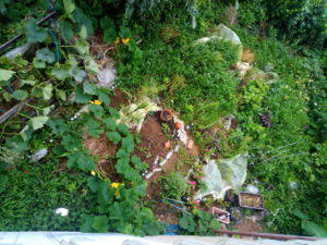 南瓜が走って、庭の彼方此方で南瓜の花が咲いて居ます。そろそろ発泡スチロールのお皿を用意しよう。