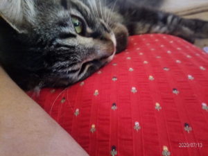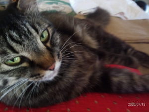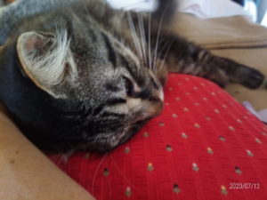 トラ子が11時半近くに帰って来ました。『僕がお当番なの。』お帰りのオヤチュとカリカリを上げました。ベッドに上って来て『赤い枕は僕のだよねぇ。』と寄り掛かって居ます(笑)。オカアシャンのだよ~!