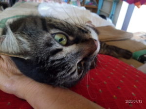 1時過ぎ、ベッドにはうめとタイガー、もう一つ毛玉が足に触りました。トラ子です。あら?どうしたの?12時頃、雨が音を立てていたから涼しすぎて此方へ避難かと思ったら、窓際には福が寝ていました。私の分からない時間帯に福は戻って来ていたんですね。雨雲レーダーで見たら夕立の雨では無く、前線が上がって来たために降った雨の様で北東へ抜けて行きました。1時半過ぎ、トラ子は外出。