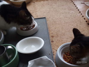 先ず、カリカリも食べるかな?ホンの少しお皿に入れました。『僕も~!』君が一番先に試食です。良い結果が出れば良いけれど、そうじゃないと、皆に『これ、旨くないぜ!』とか言われるのもなぁ…。