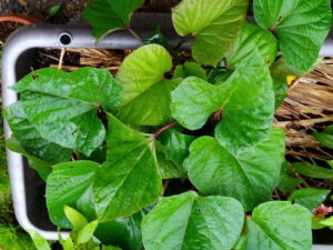 先日お隣の小父ちゃんにお分けした紅はるかもまた伸びて来ました。西隣さんでは黄色いカンナが咲き揃って来ました。
