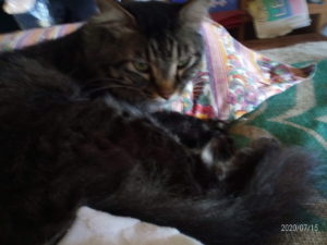 18時半、福が閉めた雨戸の向うで『入れてぇ~!』と鳴いて居ました。仕方が無い、開けるか。猫達のフロントラインプラスの効果の出具合も大分落ち着いて来ました。昨日もうめの白い毛皮の部分には弱ったノミがぶら下がって居ました。フロントラインプラスの場合付いて居る害虫は死にますので、安心していられます。トラ子の顎の下に喰いついているマダニも、毎日触って居ますが、気のせいか小さくなったような気がします。