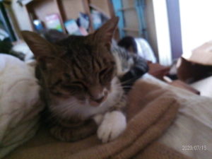 トラ子と昼寝をしていたら、福がいつもの場所取りをしてトラ子は何処かへ行きました。その内にうめも来て皆でベッドでお昼寝でした。自分達の寝床があるのに…でも、嬉しいからOKです。途中で、脚の置き場が無くて、寝ぼけながら”エ~ッ!?なんで???”とか思っていたのは覚えていますが、トラちゃんが戻って『オイ、福、半分ゆじゅれよ~!俺の席だじょ~!』とか言って戻ったのかな?(笑…よくやった!)