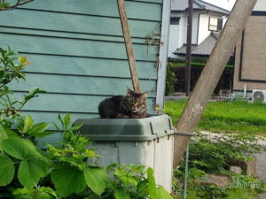 縫って居る途中で、アレッ!?トラ子がいない!福は私のベッドの上…最近は自分達のベッドだと思っているみたいです。私30㎝幅で寝ている時在りますよ。ベッドからも転げ落ちて、トラ子とうめが『なにしてるの?』見たいな顔されたし…ベッドの下を見ても居ない。まさか、私のTシャツの箱?引っ張ったら重い!きらりと光るトラ子の目がみえました(笑)。これから着るTシャツなのに…『オカアシャンの匂いがする布があったよ~。Tシャツかぁ!寝押しして上げるねぇ。』位の気持ちなんだろうなぁ。まさか、また使う事は無いよねぇ???念の為、対策をしなくちゃ。写真は昨夕、夕涼みをするトラ子。