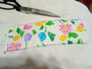 ⑤端から5㎜おり、アイロンで押さえ、更に1㎝居ります。此処が耳に掛けるゴムを通す所です。その部分を縫います。