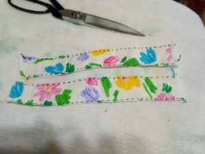 ⑥ゴムを通します。2.5㎜のゴムが良いそうですが、家に無かったので、下着用?の薄い5㎜の平ゴム黒を入れました。