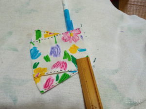 ③短い方の辺の端から3㎝に印をチャコペンでつけます。鼻と顎の部分を引き出し、印の処で留めます。アイロンで表裏共に押さえます。