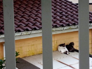 『オカアシャン、晴れるって言ったよねぇ…雨じゃん!?』2時半くらいから猫達は活動していましたが、3時少し前に起きてしまいました。福とトラ子がジュレとカリカリを食べて、トイレ外出していたうめが帰って来て食事中です。福は物干しで涼んでいます。どことなく暑いです。