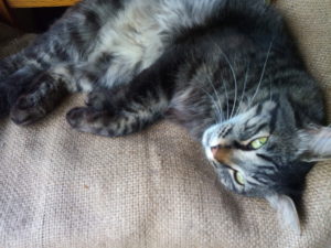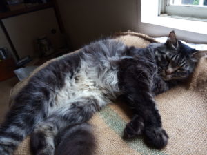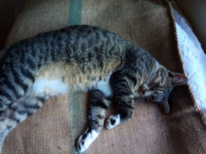 一階で餃子の皮を仕込んで二階に上がって来たら、アレレ…嫌な音がカリッシャリッと聞こえて来ました。『だれなの!? そんな事をしているのは!』タイガーさんは自分が悪い事をしているのを知って居るから委縮して小さくなっていました。首根っこを掴んで、齧ってしまったシーバーデュオの袋を突きつけると、最初は猫パンチを繰り出そうとしましたが、抵抗は止めてブラン、と吊り下げられたままで居ました。離すとそのまま床に寝て仕舞いました。これ以上は体罰はしません。お腹が空いていたのでしょう。
