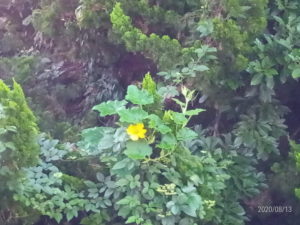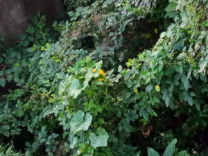(左)南瓜の花はカイヅカイブキの中にも、(右)椿の樹の上にも咲いて居ますが、残念ながら届く高さではありません。これもカイヅカイブキに上ろうとしています。南瓜は高い処が好きで。空中で実を着けるのが好きですよね(笑)。実が綺麗に育つので、大歓迎ですが。