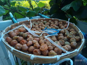 (左)一昨日干した梅をまた干しました。手前に色付いた物を置きました。