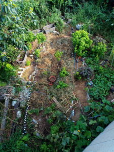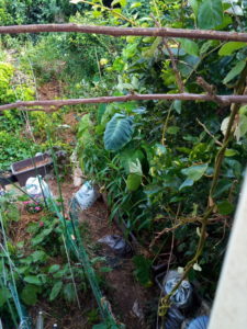 毎年、良いアイディアだと思って実践してもミニトマトで通路が塞がれたりして来ました。それを少しずつ調整しながらやって来ましたが、今年の里芋畝の土留めにプランターに植えた生姜を使ったのは成功しました。楽に通れますし、生姜にもある程度日が当たりますし、今の処は順調に成長している様に見えます。途中でマルチングを足したのも良かったかな。
