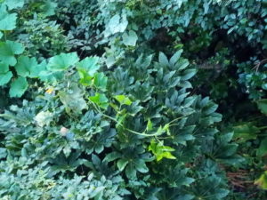(右)おたふくさんに下りて行った南瓜が何ヵ月ぶりかで戻って来ました。蔓の先端が生垣の上に在ります。