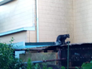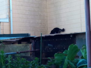 (中)トラ子がお隣の物置の屋根から私のやる事を見ています。『オカアシャン、何してるんだ?』