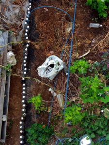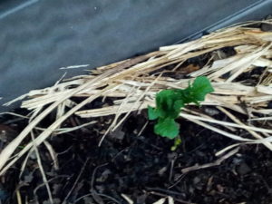 葱の植えてあるところや、(左)大根畝に水を撒き、もう少し丁寧に土寄せをし、燻炭を上から掛けました。既に本葉が出て来ているものもありましたが地際で根切り虫にやられてしまったものも何本かありました。不足分は今日蒔き直します。