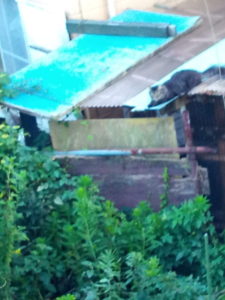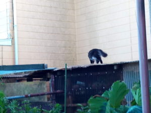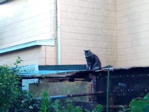 (中)トラ子がお隣の物置の屋根から私のやる事を見ています。『オカアシャン、何してるんだ?』