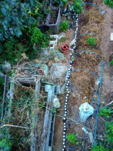 (中)ブロッコリー畝の東の端には葱を植えていますが、大蒜も植えようと思いますので、溝を掘り燻炭を撒きました。