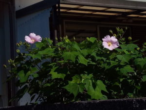 (左)Hさんのお宅の夏芙蓉。薄いピンクの綺麗な色です。