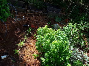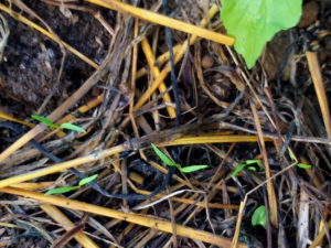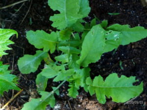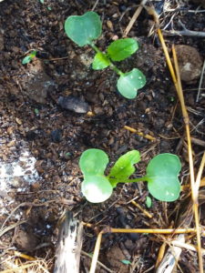 (右)後蒔きの発芽大根秋祭に本葉が出ました。