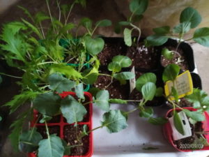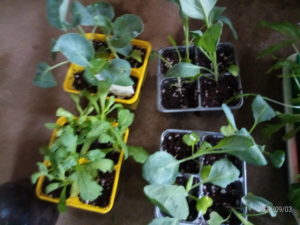 (右)みさきキャベツ6個、水菜4本、おまけのケール1本、ブロッコリー緑れい4本の苗です。小さい!これは鉢増しして物干しで暫く育てます。只この位で定植した方が強いのかも知れません。塚原農園さんがこれより小さい苗を畑に植えておられます。