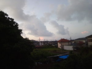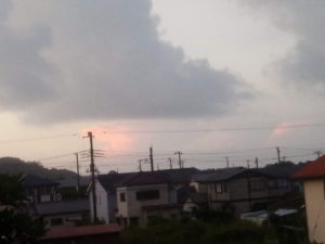 (中)南の海の上の入道雲に茜色の反射が見えました。
