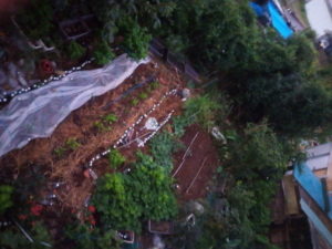 これが最終形かなぁ。動いて見て二階に来てゆっくりしながら、写真を見るとまた違うんですよね。さっきの雲は行って仕舞いました。B1畝のボトル際にもホワイト6片を途中まで埋めました。