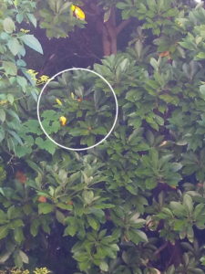 (左)カイヅカイブキの中に上った南瓜に花芽が2つ上がっています。