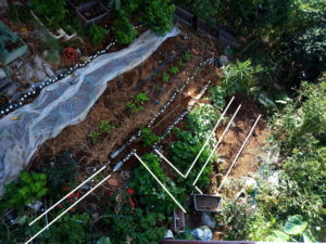中央通路にボトルを設置しています。メリットはボトルで畝の肩が崩れるのを防いでくれます。サツマイモは一部収穫しても好いかなぁ。まだまだ細いお芋だろうけれど、大蒜や今年の初夏まで別の畝で育ったために施肥が忘れられ、小さいままの収穫だった玉葱も植えて上げたいな。大蒜は背が高くなるのが早いから西側にしようか…と迷って居ます。