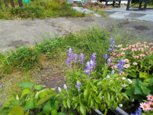 (左)お盆頃迄は草茫々で花が1つー2つしかついて居なかったサルビアです。この花は庭でそこそこの背丈で明るい色で楽しませて呉れます。強健!