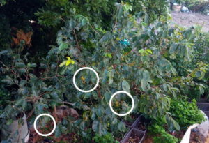 (中)よく見ると8個の実を着けています。未だ受粉したてで黄色の花は未受粉かな?