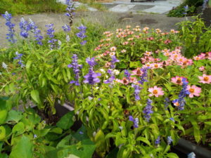 (左)お盆頃迄は草茫々で花が1つー2つしかついて居なかったサルビアです。この花は庭でそこそこの背丈で明るい色で楽しませて呉れます。強健!