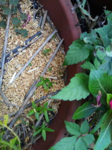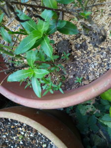 日日草の零れ種の発芽です。赤と白いアイの在る濃いピンクとサーモンピンクの花が交雑しているかも知れません。強いですね。