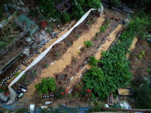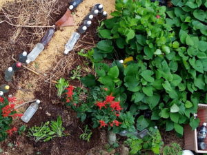 B2畝の一番南にEM団子を一つずつ埋めて、ボトルを立ててあります。そこにケール2種を間もなく定植致します。
