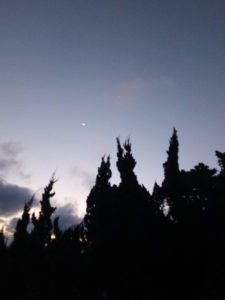 (左)5時2分の空、枝の直ぐ先に細い月が掛かって居ました。この5分後には雲が来て見えなくなりました。