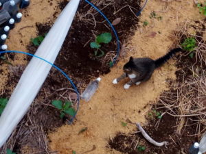 うめがみさきキャベツの辺りを掘り掘り…『うめちゃん!!』と強く二階から叫んだら『やば~い!!』と逃げ、行った先が先日施肥をしていた白菜畝でした。『畝で御用を足しちゃ駄目よ!』、と言ったら『ニャ~ン!、ニャ~ン!(草と私とどっちが大事なの!)』と抗議して来ました。『草じゃなくって野菜だよ~。私が食べるの!』『…肥料上げちゃった…』もう、海水EM活性希釈液を上げて置きます。お風呂に入る前にチェックをして来ましたが、大蒜とレタスが掘り返されていました。キャベツはギリギリセーフかなぁ…。たっぷり掛けて来ました。