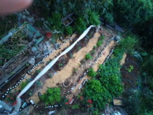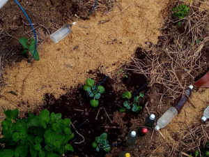 B2畝の一番南にEM団子を一つずつ埋めて、ボトルを立ててあります。そこにケール2種を間もなく定植致します。