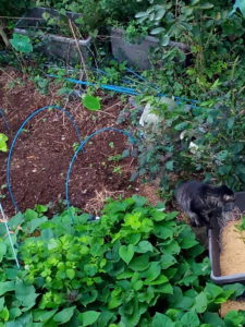 (左)あっ!里芋の葉の傍に黒い影…トラちゃんでした。