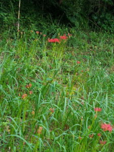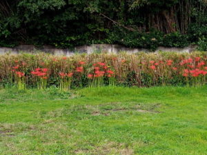 (左&中)小学校の彼岸花。(右)郵便局に行く途中、日当たりが良い所で他より先進んでいる一群がありました。