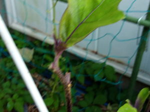 (中)八手の中でジワジワと育っている南瓜。最後の南瓜だから良い種が採れそう。後1週間位で収穫かしら?未だ蔓のコルク化が余り進んで居ません。