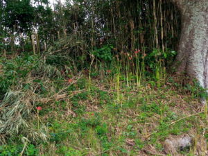 (左&中)小学校の彼岸花。(右)郵便局に行く途中、日当たりが良い所で他より先進んでいる一群がありました。