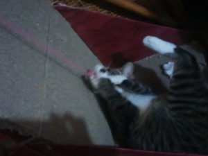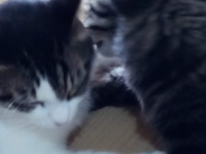 食事中に猫達が集まって来て何か物欲しげにしているので、私の事を見て『一人で食べて居る…分ける気はないのかにゃ?』、見たいな雰囲気だったので、カリカリにシーバーデュオを入れて上げました。食べたら、即、遊びにいきました(笑)。『だって、一日中寝て居なきゃならなかったんだよ~』