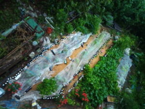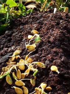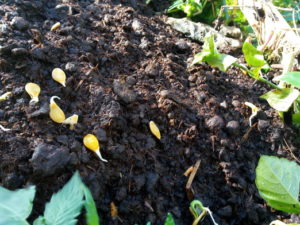 堆肥枠の中へ入れられた南瓜はそこそこの気温と雨にこれから牛糞堆肥に根をおろすのでしょうか?これが成功したら1月蒔きの人参をGW当たりで収穫しつつ、収穫跡に直接播種して不織布の下で苗を育てる事が出来ます。そういう意味ではこの実験で、来年の一手間、二手間が省略できる…不器用な私には発芽した種をちゃっかり利用した大事な実験です。